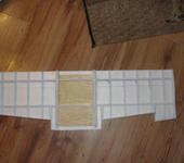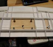 Механизацию верхнего крыла. решил исполнить на одной серве через промежуточные качалки. Элероны нижнего крыла будут управляться двумя сервами (таким образом можно будет поэкспериментировать с настройками типа флапероны замикшированные на газ, закрылки и тд.). Среднюю часть крыльев усилил фанерой т.к хочу сделать крылья съемные(по возможности избежать крепления на резинках) и к тому же на нижнем крыле будет смонтировано шасси, а пенопласт не дает нужной жесткости да и крепить в него сложнее чем в фанеру, пришлось усиливать.
