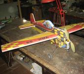 Карбоновыми прутами усилил РН крест на крест, и сделал подкосы на стабилизатор, тем самым компенсировал недостаточную жесткость хвостового оперения (основной недостаток этого самолета), вроде стал рулиться более остро и точно. Тоже отрезал элероны и вклеил их на майларовые петли. Моторама стоит металлическая опционная, спасибо Толику (Bimer). Покрасил аэрографон низ, полоски, как у оригинала, а то было все белое. Чтобы не терлась хвостовая пятка, вживил в нее небольшое колесико. Родные кабанчики из комплекта никакие, вырезал свои из листового карбона толщиной 1мм