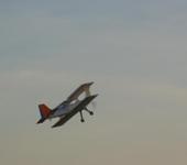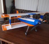 У меня сложилось впечатление не хватает мощности двигателя и центровка получилась задняя, чертежей ни каких не было, просто обвел фюзеляж на доске, где должен находиться Ц.Т. на «собачке» тоже не знаю, она мне досталась не новой и без описания. Где-то читал, что на большинстве бипланов по передней кромки нижнего крыла. Удлинить «морду», получается «урода», сдвинуть аккумулятор вперед некуда, упирается в мотораму, расположить поперек фюзеляжа не удобно. Я поставил двигатель потяжелей и помощней (с тягой под 1кг.) Центр тяжести сдвинулся вперед, сейчас находится в районе лонжерона нижнего крыла. Последующие полёты стали интересней, но был ветер, так что я особо и не понял, по ветру летит быстро, против может на месте висеть, как будто в стенку уперся, добавляешь обороты, против ветра тоже летит. В основном я летаю на «слойке» легкой и вертлявой.