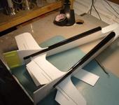 Крыло чуть-чуть гнутое, больше не смог. Состоит из трёх частей - центроплан и уши, равные старым крыльям. Клей - МОМЕНТ-Гель (синий тюбик). Сделал ещё небольшой самолётик (размах 600 мм) и F-22 (ещё не летал)