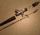 На этой фотографии отбражена конструкция и принцип работы всех толкателей возвращателей. Верхняя раскладка -неподвижные части, слева направо-защитный кожух пружины с регулятором ограничителем,основной корпус с трубками подвода воздуха снизу и краски сверху, фиксирующая гайка еще одного защитного кожуха педали,контровочная гайка сопла,защитный кожух педали, сопло. Нижняя раскладка подвижных частей-возвратная пружина, шток, сухарик(поперек маленькая штучка) и игла(все скручено вместе),толкатель иглы,педалька,дюза (она неподвижна). Работает так-давим на педальку-она сдвигается назад-давит на поперечный сухарик-сухарик сдавливает возвратную пружину и отводит назад из дюзы иглу-игла открывает подачу краски. Для чего нужен поперечный сухарик-при замене дюзы-её дырка становится либо больше, либо меньше и игла перемещается назад или вперед. На педальке образуется люфт. Вот его и убираем подкручивая задний шток и сухарик.