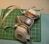 И неплохо позаботиться о себе любимом. Я работаю только в резиновых перчатках.Это не только руки от краски защищает, но и пенопласт и трафареты от ваших рук. Перед работой неплохо протереть подготовленные под покраску детали раствором спирта в воде, очень нежно и аккуратно не надавливая сильно и не слишком влажной тряпочкой. Нос хорошо защитить от красочной пыли.Я использую простой распиратор (к сожалению нет фото), зелененький такой поролоновый. При покупке обратите внимание на резиночки которыми он крепится к голове. Они должны быть плотными зеленого цвета, (это военное изделие) белые тонкие разлезутся быстро. Он прекрасно предохраняет от пыли, но от паров спирта не спасает. При длительной работе прилипает к коже и отмокает лицо т.к. изнутри проложен целофаном. Я говорю про длительную “сессию” часов эдак в шесть. Перепробовал много всяких намордников и остановил свой выбор на маске 3М. Это полная защита от красочной пыли и паров растворителя. Имеет сменные фильры и предфильтры (это небольшие белые тряпочки задерживают основную массу сухой пыли). Удобно сидит на лице и имеет очень удобную “сбрую”. Она закрепляется на шее и на маковке. С маковки её можно снять глотнуть свежего воздуха, а маска болтается на шее. При покупке обратите внимание на размер их есть по моему три. Или просто приложите маску к лицу.