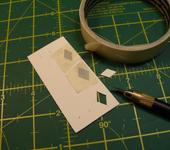 Главная функция трафарете не допускать попадания краски в ненужные места, и обеспечивать четкую линию рисунка. Поскольку работаю с водной краской, он не должен намокать, разбухать, и деформироваться в процессе работы. Быть достаточно жестким и не “флатерить” под струей воздуха. Я использую ватман (200-250гр) или тонкий картон. Перед вырезанием рисунка протираю лист с обеих сторон нитро краской или лаком. Можно это сделать после вырезания, но крайне осторожно кисточкой не набирая много лака. Чем больше рисунок- тем толще материал трафарета. Но…НО… толстый материал образует ступеньку и не позволяет получить четкую границу рисунка.Поскольку напылять краску нужно под углом к трафарету или вертикально. поэтому вырезаю под углом к плоскости. Скос обращен всегда внутрь, это позволяет сделать минимальной ступеньку между трафаретом и плоскостью окрашиваемой детали. В этом проекте сделал трафарет из потолочки. Понравилось-не намокает, жесткий, правда толщина…