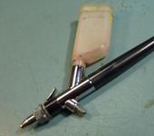 У старого аэрографа я полностью изготовил новую пелальку. У нее разбивается отверстие и на задней грани где упирается шток выбралась ложбинка и подклинивала. Вот на фото новая педалька изготовлена из старой столовой вилки.