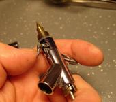 Вот дюза (на переднем плане-желтенькая), стоит вертикально -сопло, на аэрографе накручена контровочная гайка, она самая передняя и большая. Если не отцентрировать факел краска будет скапливаться на краю сопла-там где оно расширяется. Это можно определить-если шипение выходящего воздуха изменится на свист. Пойдут по краю красочного пятна крупные капли. Если в бачке для краски пойдут пузыри, значит либо дюза неплотно-до конца закручена в корпусе и воздух сочится в обратную сторону,либо она засорилась.