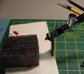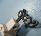 Подставка под аэрограф.Сделал из того что было под рукой. А именно-струбцина (остаток от лампы)-полстая проволока в изоляции.Согнул. Два конца проволоки зафиксировал в отверстии деревянными клиньями.