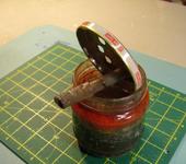 Конструкция такова-в завинчивающейся крышке сверлю 4 отверстия в одно вставляю трубку-резиновую,силиконовую и т.д. диаметром равным соплу аэрографа.В банку наливаю воду -она должна чуть накрывать кончик трубки. Как это работает. При вставливании в трубку сопла и подачи промывочной жидкости начинается пробулькивание и почти вся гадость остается вводе. По окончании процесса вылить грязную воду. В этой процедуре важно тщательнее промыть аэрограф-если остатки краски засохнут в дюзе…ну сами понимаете. А если все засохло? Не нужно выковыривать-положите дюзу и сопло в теплую воду на день все само отмокнет, тоже и с нитрокраской положите в баночку с ацетоном и закройте крышкой часа на два, а затем аккуратненько кисточкой и заточенной зубочисткой.