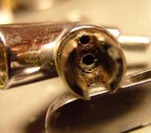 У старого аэрографа я полностью изготовил новую пелальку. У нее разбивается отверстие и на задней грани где упирается шток выбралась ложбинка и подклинивала. Вот на фото новая педалька изготовлена из старой столовой вилки.