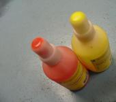 Краску лучше процедить. Можно купить фирменную воронку или через капроновый чулок. Может показаться излишей возней, но когда на пике вдохновения забъется дюза … Можно и не цедить. Процеженную и разведенную до нужной консистенции краску я разливаю в баночки с узким носиком-удобнее наливать в аэрограф. Покупаю в аптеке “перекись водорода” сущие копейки.Полупрозрачный бутылк не разъедается даже ацетоном, на крышку напыляю цвет и ставлю в коробочку.