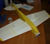 Обклеил крылышко скотчем . Навесил элероны .В процессе постройки решил сделать ценроплан с лонжероном из бальзы.