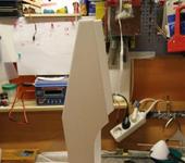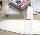 Сделал вырез под крыло (по инструкции, но верхняя поверхность крыла не совсем совпадает с вырезом), пристроил крыло. Про помощи шаблонов выставляем нужный угол деградации (стабилизатор при этом должен быть параллелен поверхности стола) и вклеиваем стабилизатор и киль.