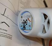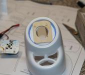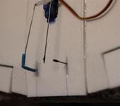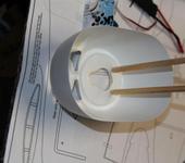 Моторчег в оригинале крепится своей рейкой 10х10, как и многие велосипедные звонки. Поскольку мотор у меня другой, пришлось немного пофантазировать. Сделал вспомогательный мотошпангоут, приложил к капоту (отверстие заблоговременно не стал полностью вырезать) и прошил двумя рейками 5х5. Отметив на пенных деталях с помощью этого-же фанерного шпангоута места под отверстия, прошил и их заострёнными концами реек. Вместе с капотом после вклейки должно держать крепко.