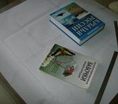 Итак, склеиваю чертеж узким желтым скотчем (у меня первая версия, без меток совмещения, так что пришлось повозиться). Чтобы листы не пузырились, прижимаю тематической литературой, а вдоль шва кладу металлические линейки - получается довольно ровно: