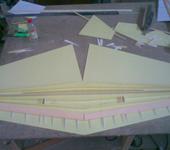 Начал делать крыло с нервюрами, то ли торопился, то ли вдохновения не было, короче говоря дело не шло. А по планам нужно было крыло заложить. Отложил, точнее сказать отбросил в сторону испорченные нервюры и тут же переделал на продольные лонжероны, усиление сделал из абаша, остальное потолочка с ниткой по торцам, где будет отрезаться элерон проложил пеноплекс.