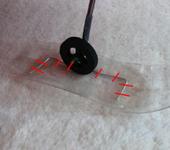 Красными линиями обозначены места разрезов, куда продета алюминиевая проволока. Сверху все проклеено скотчем. Проволочная стойка примотона изолентой к основной. Получилась очень удобная быстросъемная и лёгкая конструкция. Вес - 10гр.