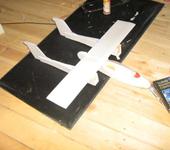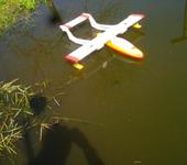 Вот так это должно быть! Примерка. Но будет все по другому… Подкинул мне идейку Вадим Руденко…Поднять мотогандолы на крылья и поплавки приделать. Пойду делать шасси. Примерка поплавков и РВ. Очень симпатичненький самолетик -амфибия. Но шасси я хочу оставить, как у летающих лодок. Ну, уж раз амфибия значит нужно делать редан. Я не стал срезать часть фюза и приклеил снизу необходимой толщины пенопласт. После просушки уберу все лишне и обклею скотчем. Пока выглядит так (заклеен технологическим скотчем). Примерил капоты на моторы, сделаны из крышек от пены для бритья. Нужно прорезать щели для охлаждения… Пересмотрел свое намерение по поводу шасси. Я пришел к выводу , что шасси (как у летающей лодки) если их не сделать убирающимися, будут мешать модели при взлете, поэтому решил их сделать съемными, использовать при взлетах с земли. А при взлете с воды будут устанавливаться дополнительные РН , опущенные в воду (на обоих килях). "Послушный "- “Доцайл” кусается! При доводке хвостового оперения порезал большой палец левой руки, теперь работа затормозится. Авиамоделисты присылают мне свои импровизации на эту тему. Много интересного… И даже видео…
