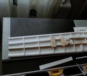 Все крыло представляет собой куски пенопласта (ПБС 35)шириной 98(±1 мм) толщиной 38 мм и длинной 240 мм (под 2 элемента расположенных “валетом” )в которых просверлены отверстия под карбоновые трубы и между ними третье отверстие под проводку.Потом это режеться струной по шаблонам профиля для центроплана естественно шаблоны 2 одинаковых ,под уши постепенно сужающиеся к концу.