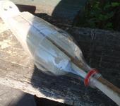 Осаженную бутылку можно снять с болванки и не разрезая (за исключением средней части фюзеляжа), даже если нос самолета шире фюзеляжа (в разумных пределах), я для этих целей разрезаю болванку вдоль (до середины фюзеляжа) и в получившуюся щель вставляю клин. Если нос круглый можно сделать два разреза (+) и вставить в середину круглый клин. После осаживания бутылки клин вынимаю… Креплю бутылку к болвану при помощи скоб степлера.