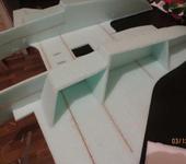 С некоторыми конструктивными решениями я не согласен,но из уважения к автору постарался максимально точно делать согласно чертежа.Но одно я точно не мог пропустить,-автор клеит уголь на плоскость,я же врезал в пену перпендикулярно,не темном это уголь 6x1,на светлом фанера 6x1,жесткости в обоих случаях достаточно,на угле с избытком.
