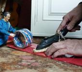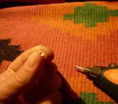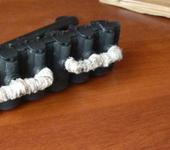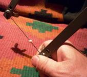 Теперь амортизация. Отрезаем верхнее ушко крепления, а нижнее оставляем,это будет центр вращения. Верхнюю часть обтачиваем и фиксируем резиновым шнуром. Костыль покрываем лаком и накрашиваем нижнюю оковку.