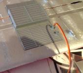 Заодно решим проблему с проводами от машинок, идущих от верхнего крыла в фюзеляж к приёмнику. Хочется их спрятать. Для этого есть очень хороший вариант. На оригинале радиатор расположен в верхнем крыле. Нагретая вода поднимается вверх, а охлаждённая спускается вниз. От радиатора к мотору идут два шланга. Под один из них и замаскируем провода.Этот провод заменит муляж шланга имитирующий подвод охлаждённой воды в мотор. Вскрываем радиатор и укладываем разветвитель под него, а в патрубок врезаем провод к приёмнику.Потом провод красим в цвет алюминиевой трубы…