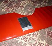 После обтяжки перед покраской необходимо покрыть поверхность грунтовкой для пластика. Это очень увеличивает сцепление краски с поверхностью. Краска прилипает так хорошо, что позволяет наклеивать и отрывать малярный скотч. Красим нижнюю поверхность серебрянкой. Верх красным.