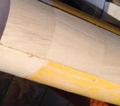 Оклейка фюзеляжа почти закончена. Заодно удалим привод заднего колеса, которое производитель заботливо поставил перед хвостовым костылём. Понятно,что это сделано для лучшей управляемости на земле, но это,как у телеги пятое колесо. Настоящие самолёты такого типа на земле разворачивались исключительно руками и взлетали и садились строго против ветра. Сделаем на модели так же. Вырезанный кусок заполняем пеной или бальзой и шлифуем заподлицо с поверхностью фюзеляжа.