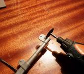 Теперь амортизация. Отрезаем верхнее ушко крепления, а нижнее оставляем,это будет центр вращения. Верхнюю часть обтачиваем и фиксируем резиновым шнуром. Костыль покрываем лаком и накрашиваем нижнюю оковку.