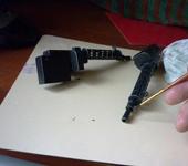 Заодно решим проблему с проводами от машинок, идущих от верхнего крыла в фюзеляж к приёмнику. Хочется их спрятать. Для этого есть очень хороший вариант. На оригинале радиатор расположен в верхнем крыле. Нагретая вода поднимается вверх, а охлаждённая спускается вниз. От радиатора к мотору идут два шланга. Под один из них и замаскируем провода.Этот провод заменит муляж шланга имитирующий подвод охлаждённой воды в мотор. Вскрываем радиатор и укладываем разветвитель под него, а в патрубок врезаем провод к приёмнику.Потом провод красим в цвет алюминиевой трубы…