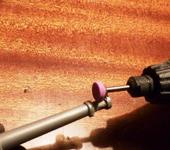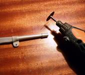 Теперь амортизация. Отрезаем верхнее ушко крепления, а нижнее оставляем,это будет центр вращения. Верхнюю часть обтачиваем и фиксируем резиновым шнуром. Костыль покрываем лаком и накрашиваем нижнюю оковку.