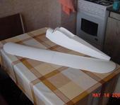 Вот доделал 2-е крыло, во внутрь вклеены рейки из потолочки для укрепления, карбоновых трубок у нас не продают! а лонжерон будет, но не по всей длинне, я зделаю прорезы и вставлю реечку из бальзы!!! ну когда только начинал делать никто ничего не писал про крыло профильное!=) вот теперь переделывать уж никак… склеелося!=) а V будет, я зделал нервюры которые первые к фюзеляжу немного под наклоном, теперь когда 2 крыла сопоставить вместе получается V угол. ну знаете я вот как говорится на всякий пожарный вырезал и отложил 2 крыла обычных плоских! =) так что будем пробывать!..