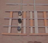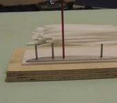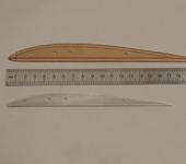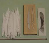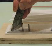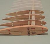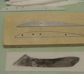 Нервюры делаю на простой оснастке. Через шаблон нервюры сверлю отверстия в толстой фанере или доске. Заготовку прокалываю вязальной спицей и фиксирую штыречками такого же диаметра (3 мм). Затем режу с небольшим припуском на обработку.