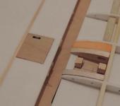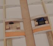 Панели обшивки делаю из двух полос потолочки, а между ними вклеивается лонжерон. Важен хороший проклей, чтобы обшивка работала совместно с лонжероном. Далее устанавливаю уже собранную часть на нижнюю панель крыла и приклеиваю оставшиеся нервюры. Заполняю межнервюрное пространство по лонжерону вкладышами из плотного пенопласта. Они образуют стенку лонжерона. Чтобы исполнительные механизмы были съёмными, вырезаю отверстие (или проем) в обшивке. В образовавшийся люк ставится крышка из 1,5 мм фанеры. Она же является основанием для установки серво. К крышкам люков приклеены небольшие липовые бобышки под шурупы крепления серв. В крыле установлены бальзовые вкладыши-полунервюры для крепления крышек люков так же на шурупах. Да, фото с линейкой для сравнения лонжеронов в корне и на конце крыла.