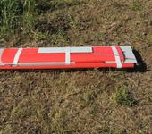 Облетал новую винтомоторную группу. Скороподъемность хорошая, но управляемость по-прежнему недостаточная. Отрегулированный на планирование, в моторном полете сильно идет вверх, несмотря на большой выкос вниз. Очень трудно противостоять ветру 5 - 6 м/с. Пара ошибок и модель уже далеко. Пришлось сажать за пределами видимости на соседнем поле, чтобы еще дальше не улетел. Догрузил нос. Центровку сместил с 35% на 33%. Стало легче. Желательно расход элеронов вверх сделать больше, чем вниз и, возможно увеличить выкос двигателя до 5 - 6 градусов вниз. На фото транспортировочная упаковка модели на листе пенопласта. Киль входит внутрь пенопласта. Всё вместе удерживается тремя широкими резиновыми лентами и дополнительно скотчем позади киля.