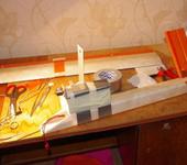 8! часов работы!!! Из них четыре-попытки заставить работать рули высоты V-образного оперения. Никак не смог заставить машинки работать синхронно. Пришлось несколько раз переделывать.Получилось то,что получилось. В общем всё готово осталось выяснить-полетит, или нет? Весов нет,до думаю в килограмм уложился. Движок 340 ВТ- должно хватить.