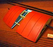 Сначала приклеиваем нижнюю поверхность,начиная с лонжеронов и близких к нему частей нервюр, чтобы всё легло ровно, потом постепенно доходим до лобика, оборачиваем его и приклеиваем верх. Потом подклеиваем и подгоняем заднюю кромку и законцовки, контролируя ровность и крутку.