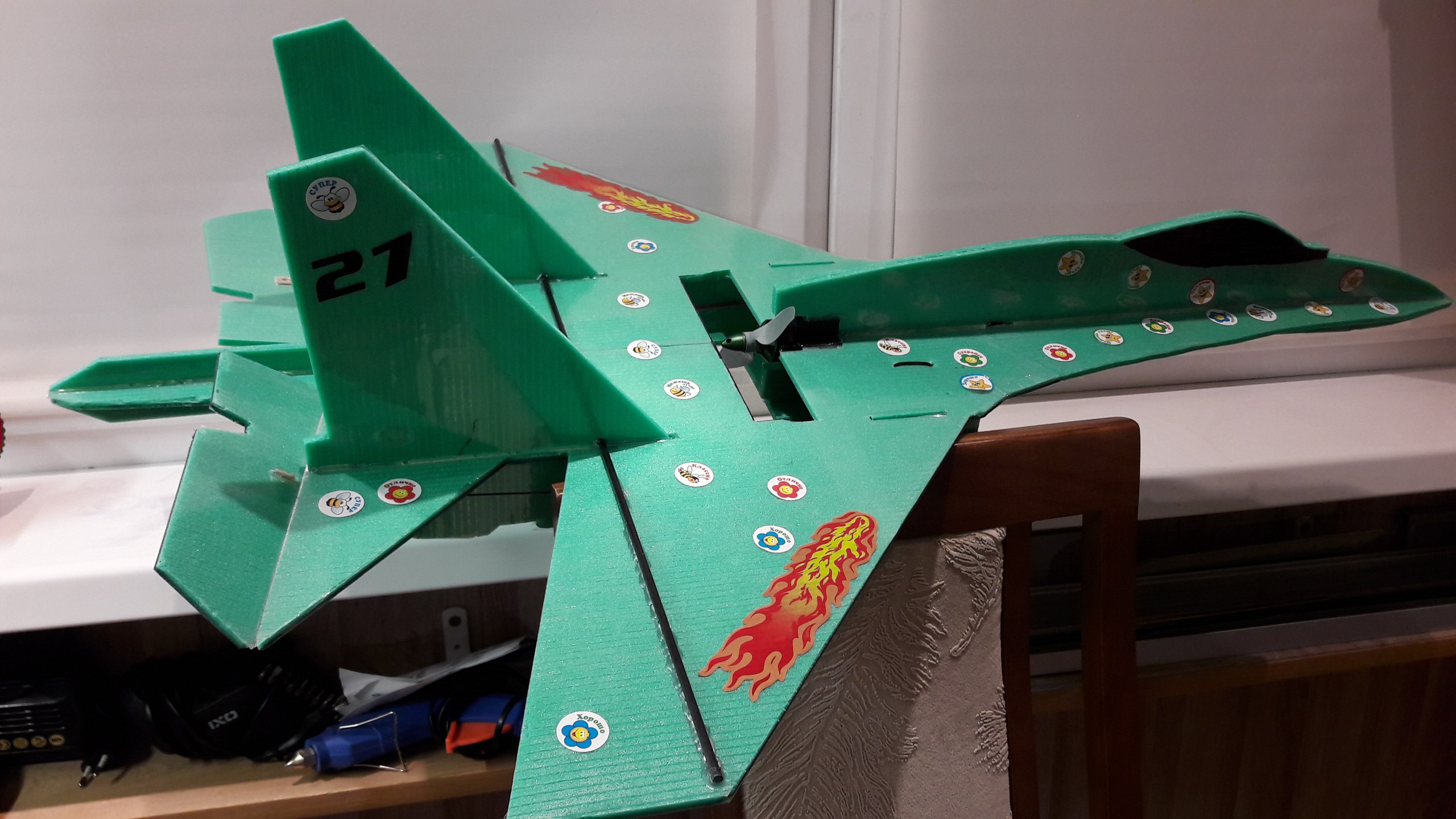 Всем привет! Давно тут не был. Решил показать самолет, склеил по мотивам Cу-27 с Хоббикинга, есть там серия “Клей и лети”, тупо взял фото их набора, где разложены плоские детали, увеличил, распечатал в масштабе и из подложки склеил сушку. На все про все пару вечеров, летает очень здорово, видео пока не снимал. Размер около 900мм в длину, 650мм размах.