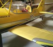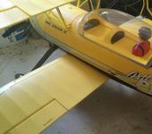 Олег, есть у меня такой самолет. И он ведет себя совсем не так, как в комментариях выше. При центровке 110-120 мм от передней кромки верхнего крыла очень стабильный самолет. Летит как по рельсам. Ничего срывного и нервного не замечал. Но не 3D. Простой копийный пилотаж выполняет отлично, на ноже летит нормально, руля поворота хватает. Элероны тоже у величивать не стоит. Но только не на 4S. Самолет тяжеловат. Замеры делал давно. Пишу по памяти, может где то чуть ошибусь, но не сильно. Вес у меня около 3700-3800г с аккумуляторами Turnigy 6S 3300mAh 30-40c и 6S 4000mAh 30-40c. Мотор Emax 4030 на 420кВ. С винтом MAS 15х7х3 выдает около 1500 kW и берет 57 ампер. Но полет так себе. Лучше с винтом MAS 16х8х3. Но там максимальный ток в статике около 80А. При максимальном паспортном токе у мотора 50А. Но зато в воздухе нет необходимости часто давать максимальные обороты и полет гораздо приятней. Мотор пока не подводит, хотя летаю на этом самолете редко и как будет дальше не знаю. Никаких модификаций с самолетом не делал. Единственное замечание, это крепление шасси. Пока что грубых посадок не было, но на травяной полосе шасси вместе с площадкой крепления колбасит не по-детски. Залил туда во все щели Ухупора, но Ваше желание вставить туда фанерку полностью поддерживаю:)