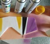 Для покраски использовал какие-то краски в баллончиках (у супруги слямзил, она что-то по работе ими красить собиралась), обычный малярный бумажный скотч и доска от ламината в качестве стола.