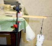 Пенопластовые бруски зажимал на краю стола по метке, а в отверсии подвешивал “ведёрко” для груза. В качестве груза использовалась картечь калибра 5,6 мм.