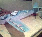В фюз и крыло вклеиваю сосновые рейки 6х3 мм. В фюз вклеивается фанерная площадка под двигатель, РВ и элероны навешиваются на полоски вырезанные из дискеты. Угол атаки 0.5 гр. Вот и все