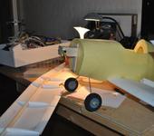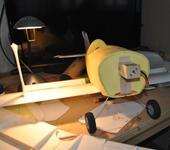 Сейчас строительство на стадии общивания верхней обшивкой крыльев. Конструкция крыла - нижняя обшивка потолочька 4мм, несущие нервюры (корневые и в местах подкосов) пенополистирол, остальные нервюры потолочка, лонжерон бамбуковая рейка, пенополистироловые закладные в местах петель, фанерная закладная в месте крепления расчалки.