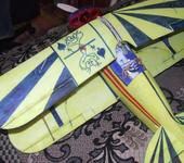 Наглухо его крепить к фюзеляжу ненужно. Два деревянных шампурика пропущены через фюзеляж, крыло крепиться как обычно резинками крест-накрест.На крыло наклеена пластина потолочки по контуру повторяющая вырез в фюзеляже, которая не дает крылу никуда сдвигаться…