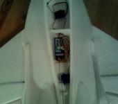 Далее - делаем прорезь в элеронах на расстоянии 7 мм от края, тягой соединяем кабанчик и машинку, подбираем местоположение машинки в мотогондоле, вырезаем по контуру, вклеиваем машинку и получаем вот такой результат: