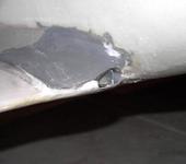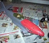 Радиатор приклеил двумя полосками 49гр стеклоткани, изображая наплывы, к подложке. Осталось облагородить с боков. Через подложку проходит болт крепления крыла, заодно поджимая подложку с радиатором к брюху. Посадки без шасси теперь противипоказаны, по крайней мере с монтированым радиатором.