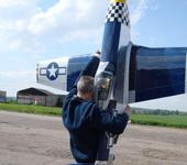 Диаметр винта Р-51D составлял 3,45м. В масштабе 1:5 это 69см или примерно 27 дюймов. представьте себе двигатель, (а это будет примерно 150 кубовый бензиныч) способный крутить такой 4-х лопастный винт, а потом попробуйте его уложить в модель. Я недавно на Тандерболт поставил четырёхлопастной АРС 14,5х11,5 - тоже пущей копийности захотелось… Так бедная 110-я Ямада усиралась, но всё же до 7500 его раскрутила, дав 7кг тяги, но поллитрового бака вертолётной двадцатки хватило лишь на 5.5 минут полёта, хотя с винтом 16х8 она вылётывала его аж 15 минут.