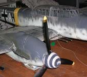 - один из самых неприятных недостатков – врождённый сколиоз крыла (его очень хорошо видно на фото, где мессер снят в полёте, вид строго спереди), который возник из-за моей невнимательности и неаккуратности – в процессе обтяжки крыла скотчем я приваривал скотч утюжком по всей его площади, в том числе и на задних кромках. Там то его и повело. Причём, заметил я это слишком поздно. Отсюда был сделан вывод: утюгом если и приваривать, то только в толстых местах. Ил-2 избежал этой участи, у него крыло идеально ровное.