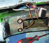 Ошибка, собственно, была только одна, но о-о-очень жирная – профиль крыла. Чёрт меня дёрнул отложить проверенный и надёжный плоско-выпуклый clark Y(с коим и летал оригинал) и пустится во все тяжкие…Результатом этого явилось то, что самолёт буквально висел на ручке, не давая расслабится ни на долю секунды. Вот тогда-то я ему морду и расквасил вдрызг (см. фото). И хотя кроме морды ничего не пострадало, т.е. крыло осталось целёхонько, было решено крыло делать заново. И обязательно с профилем clark Y. Это заняло 3 дня. Результат не заставил себя ждать. Поведение самолёта чудесно преобразилось. Из неуравновешенного психопата 😃 он превратился в маневренного, уверенного в себе бойца. И остаётся таким до сих пор, уже на протяжении 2,5 лет. Всё это время он постоянно летает, и до сих пор является одним из самых удачных моих самолетов. Пару месяцев назад, получив новое, перемотанное сердце, он получил в подарок и 6-ю машинку, на бомбосбрасыватели. Машинку разместил под маслорадиатором, чтоб она не бросалась особо в глаза. Бомбодержатели ещё не сделал. Обязательно сделаю – за такой большой срок безупречной службы он их определённо заслужил. Теперь по машинкам – зачем 5 шт? Всё просто: на элероны – 2шт, на руль направления – 1шт, и на стабилизатор – 2шт, т.к. половинки стаба конструктивно сильно разнесены, было решено ставить две машинки. Это позволило реализовать очень оригинальную схему управления: 1 и 2 каналы миксуются, и половинки стабилизатора работают, как элевоны – ручку на себя – оба синхронно идут вверх. Ручку в сторону – отклоняются, как элероны, в разные стороны. Машинки на крыле включены параллельно машинкам в хвосте через Y-разветвители, но крест-накрест: от правого элерона к левой половинке стаба и наоборот. В итоге имеем: даем крен – все 4 руля отклоняются синхронно, как 4 элерона: два правых в одну сторону, два левых – в другую. При взятии ручки на себя обе половинки стабилизатора лезут вверх, оба элерона на крыле идут вниз. И наоборот. Этакие сдвоенные элевоны. Честно говоря, полагал поначалу, что изобрёл нечто новое, потом где-то увидел подобную схему (т.е. получается, изобрёл велосипед).