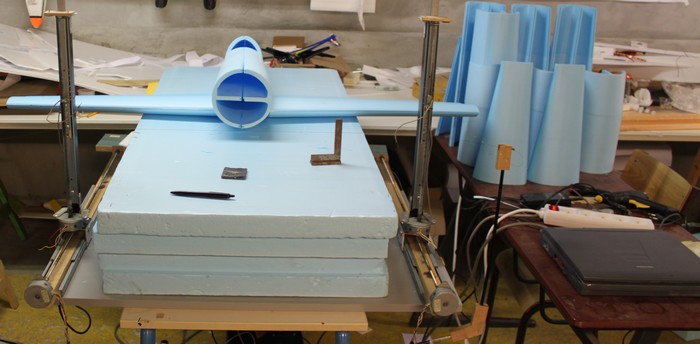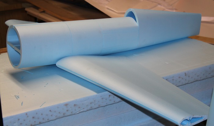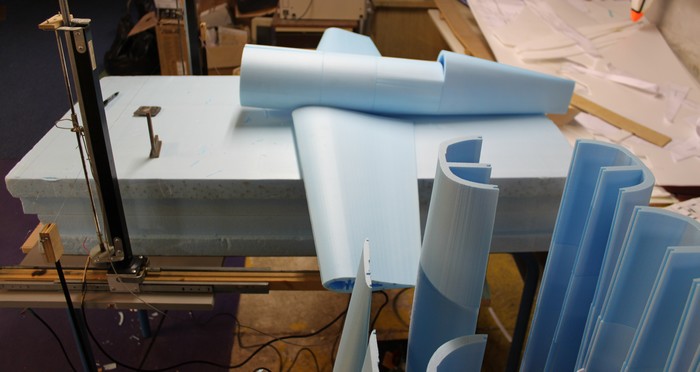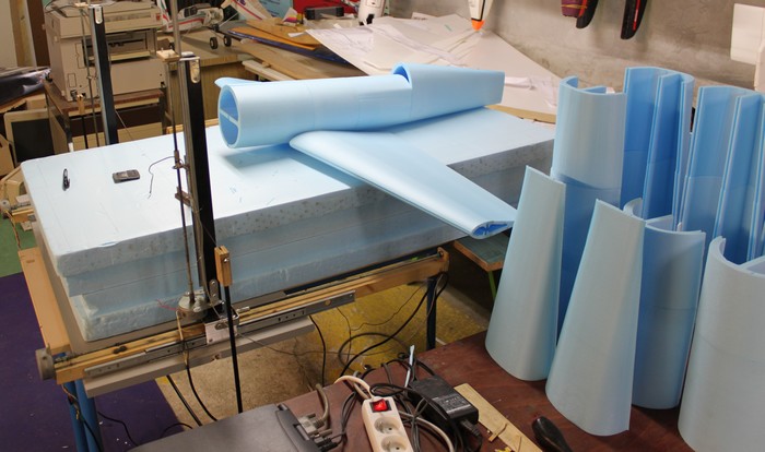Вот, немножко продвинулись, дорезали все крылья, отверстия под крылья, элероны, хвосты. Остались стабы с вырезами в фюзе под них, и два носа, и можно будет приступить к сборке. Вес - пена+лонжерон в крыле (80гр.) весит 500гр.