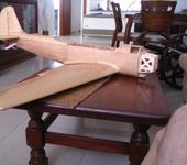 Крыло и оперение вырезаны струной из лёгкого шарикого пенопласта, “радиусным” методом -струна неподвижно закреплена в точке схождения продолжения передней и задней кромок,по внутрениму шаблону. Профиль родной Clark YH, по контуру окантованы бальзовыми кромками. Лонжероны крыла в тех же местах, что и у прототипа, в виде пластин, перерезающих крыло. До шасси из фанеры 4мм и3мм, с облегчениями, на консолях -плотная бальза . Крыло,фюзеляж и оперение оклеены на ПВА коричневой упаковочной бумагой,на подобии крафт-бумаги. Крыло- плотностью 0,68г/дм2, фюзеляж и оперение -0,36г/дм2. Нервюры на рулевых поверхностях с имитированы наклейкой полосок тонкой бумаги . Шарниры- самодельные, скоба из проволоки 1мм и петля из полоски латуни 0,5мм . Для фонаря кабины пилотов и капота двигателя отлиты гипсовые пуансоны. Болванка на фонарь короткая т.к. средняя часть составная, всё 0,5мм.